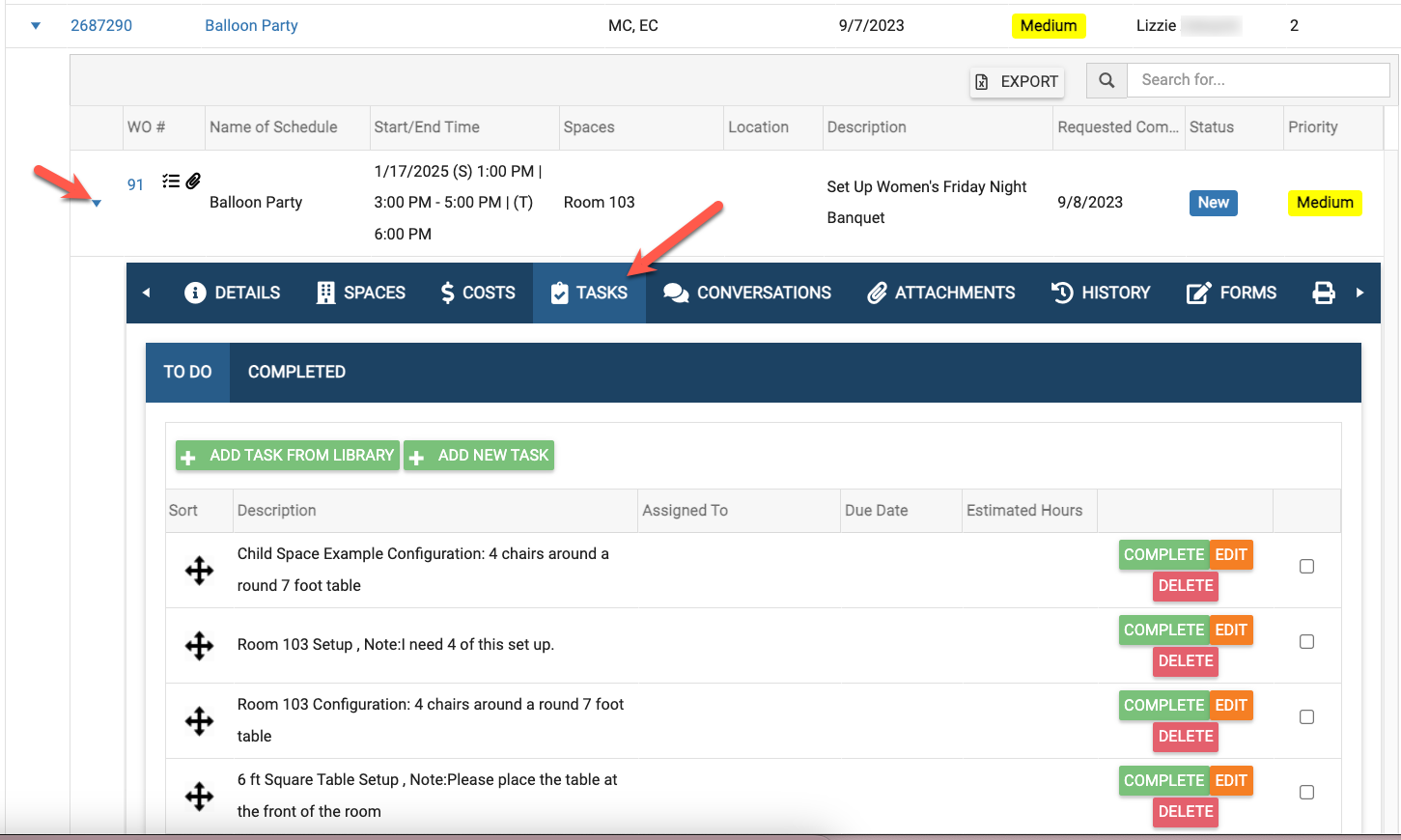 - On the generated work order, each space, resource, service, and internal form Q&A on the event will transfer over to the event as a task on the work order.