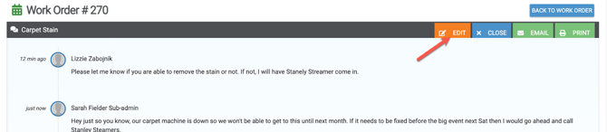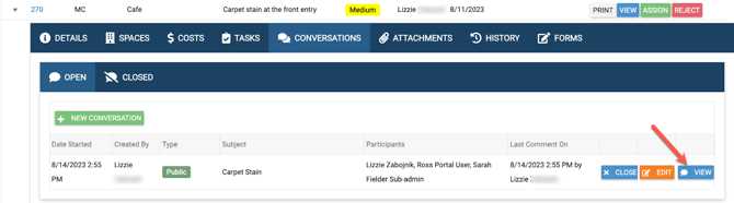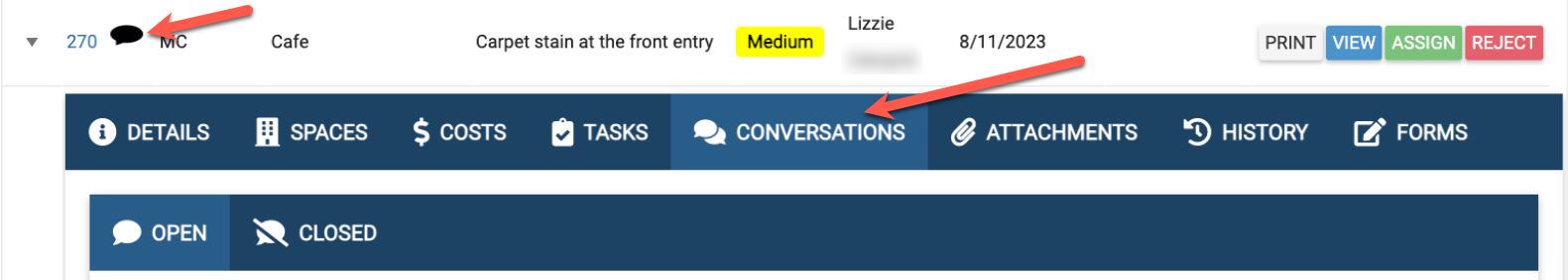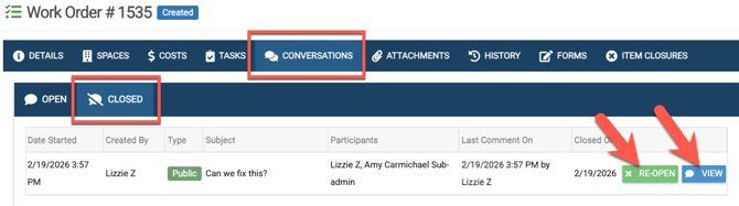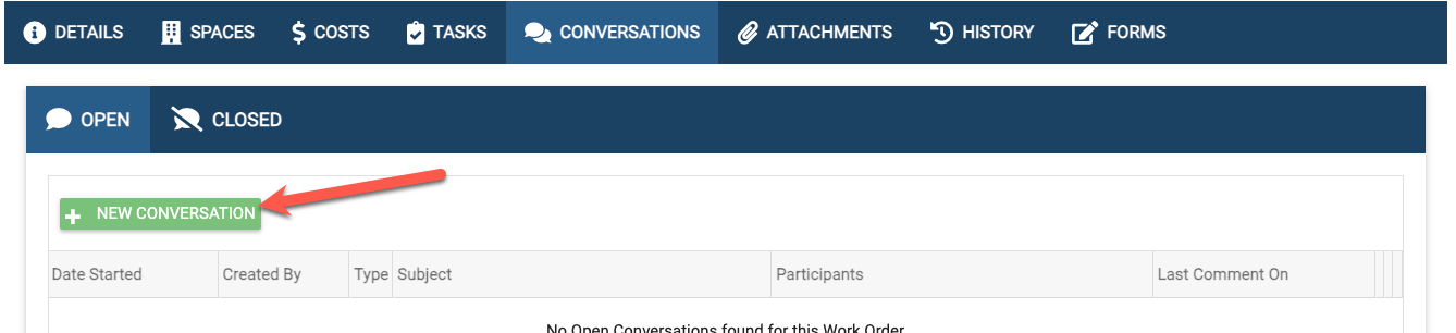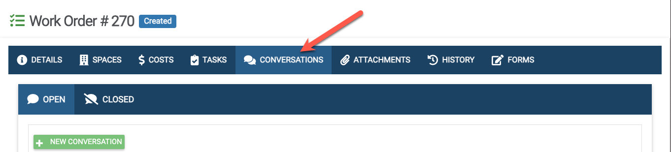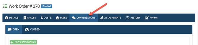Conversations can be created/viewed/edited/deleted inside a work order by clicking on the “Conversations” tab.