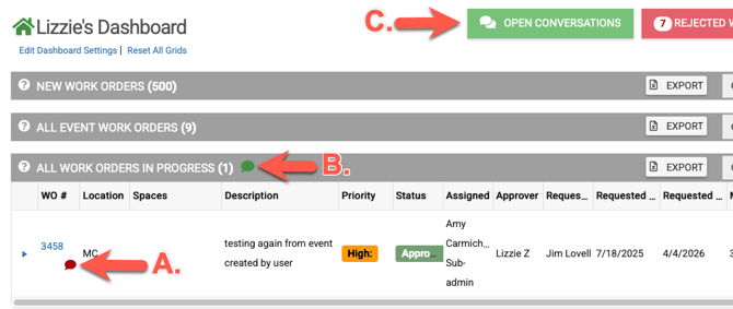 C. You can view all work orders with unread comments on them be clicking on "Open Conversations" at the top of your dashboard.