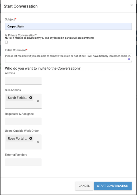 Conversations exist in Work Order Management so that all communication and comments around a work order can be streamlined and logged on the actual work order itself for future reference.