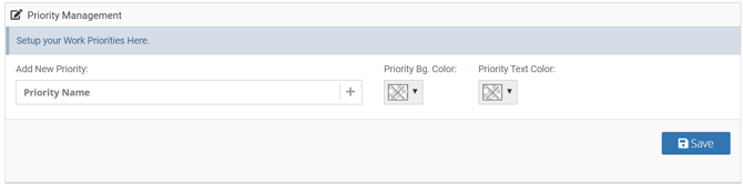 Admins can go to Settings > Basic > Priorities to change, add, or delete priorities from the account. To add new priorities, add the name of the priority, priority bg. (background) color, priority text color and SAVE.