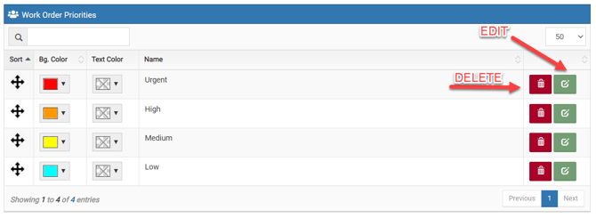 By default, you were provided 4 basic priorities as a starting point. They are Urgent, High, Medium, and Low. You can edit the name any of these by selecting the Edit button. You can also edit the bg. (background) color or the text color for each priority by selecting the drop down arrow in each column. Finally, you are able to rearrange the order these will appear when entering a work order by using the sort column to move priorities up or down. If you elect to remove one of these default priorities, simply select the Delete button.