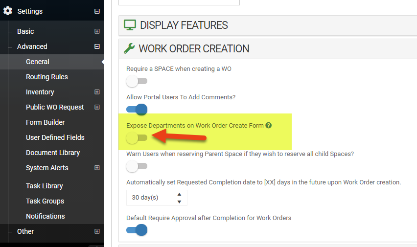 1. In order to do this, first go to Settings > Advanced > General > Work Order Creation and disable "Expose Departments on Work Orders".