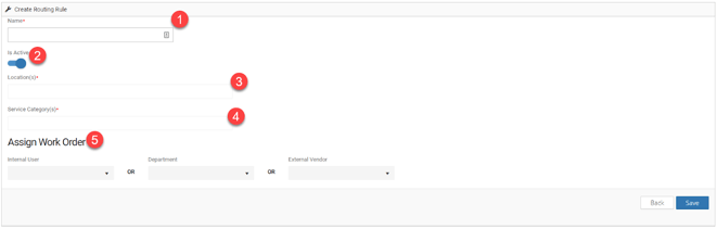 Admins can set up work orders based on locations and service categories to be automatically assigned to a specific user, department or external vendor. When a work order is set up to be automatically assigned to a user, department, or external vendor by a routing rule, the status of the work order once submitted will automatically be updated to the "Approved" status. Work orders will only appear in the "All New Work Orders" grid when they are not assigned to a user, department, or external vendor, and thus are waiting to be approved and assigned by an admin.