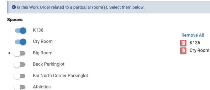 1. Click on "New Work Order" from the top of your screen OR from the left side bar under Work Orders > Add Work Order to start your work order request. You can add more than one space if needed.
