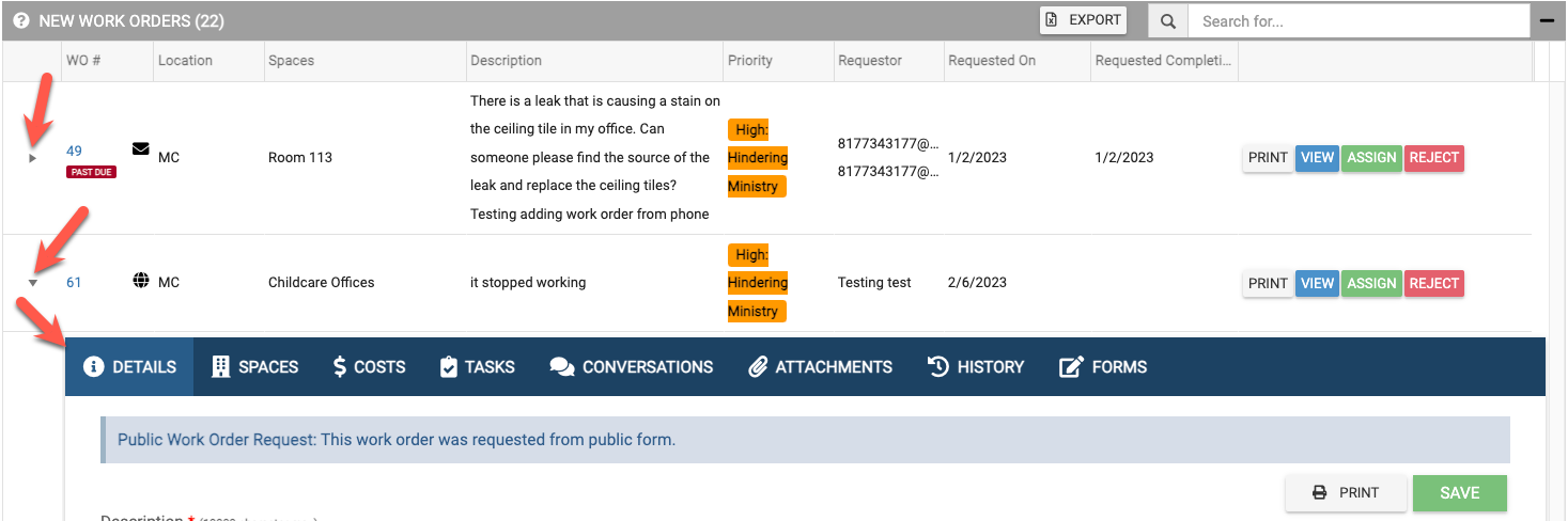 Any work orders that are assigned to a sub-admin either personally by an admin or through a routing rule will appear in their "My Assigned Work Orders" grid. From there they can expand a work order in order to see the details or click on the work order number to navigate to the page with all the details about the work order.