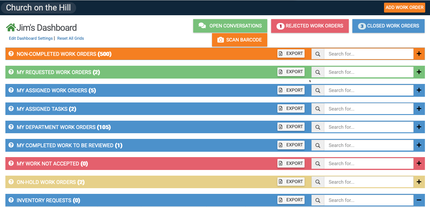 You can easily expand every grid on your dashboard by clicking the expand button "+" to view all work orders associated within. You can also collapse each grid.