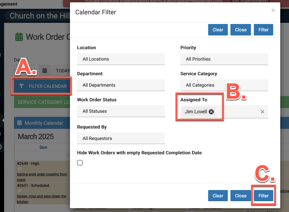 Users can view all generated work orders on the calendar and filter the work orders by the ones assigned to them, by a certain service category, etc...