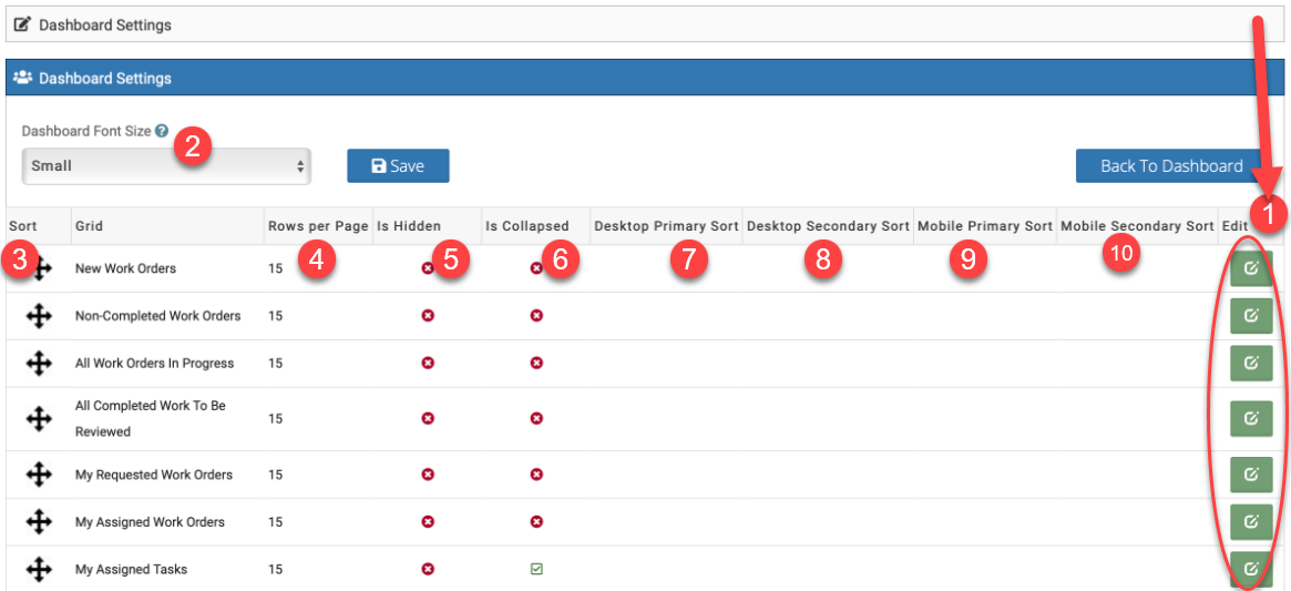 To the right of each Dashboard Grid, click the Edit button to make these changes