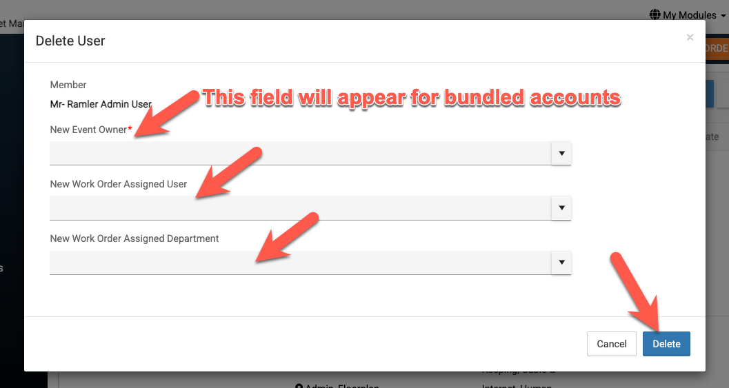 - If you are a bundled client, using both the Event Scheduler and Work Order modules, and the user has access in both modules, you will still be required to choose the new event owner, even if the user is being deleted from within the Work Order Management module.