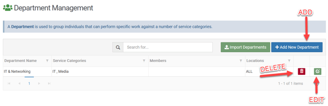 Admins, to add a Department(s), go to Settings > Basic > Departments, and choose "Add New Department". You can also edit or delete existing departments from this same page (see below).