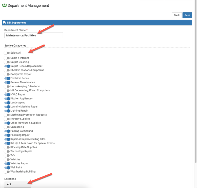 You will be redirected to a new screen where you can add your department, associate one or multiple service categories (see below) and location(s) then SAVE. You can continue adding departments by repeating the process.