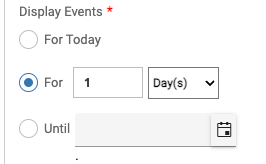 12. These options are available for all the display types, except for the Announcement option. For the other display options, these filtering options allow you to filter events by your locations (which are considered campuses in eSPACE) and your Event Categories.