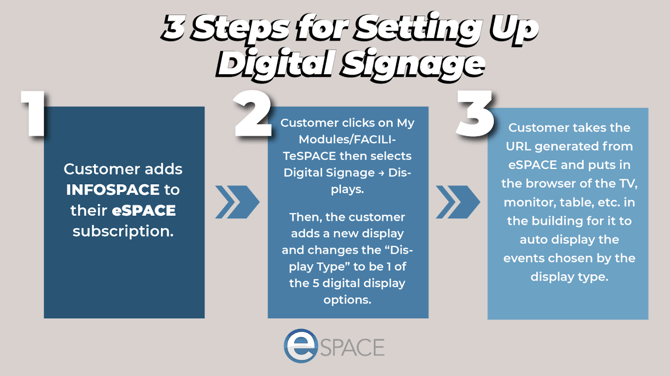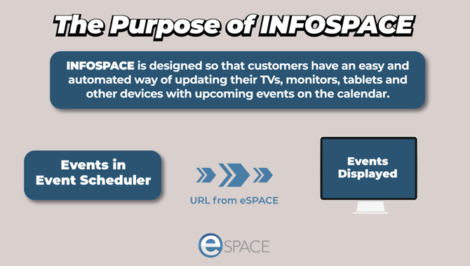 In INFOSPACE you can create digital signage displays using 1 of 4 options and then use the URL generated by eSPACE-INFOSPACE to place into the browser of your TV, monitor, tablet or other device so it automatically displays the events.