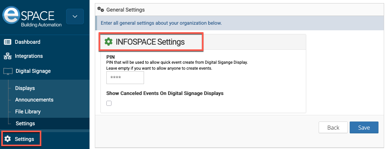 - Settings: Here, you can click on INFOSPACE Settings in order to see the option to create a pin that can be used for the "Room Signage Scheduler" display option. This allows only people with the pin to be able to use the display to create a last-minute event for a space.