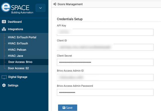 On that page, you will see the credentials that are needed from your Brivo account in order to connect eSPACE to Brivo for scheduling.
