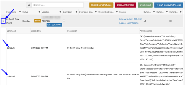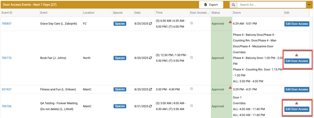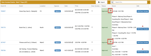 Once there is an override, a red triangle will appear above the "Edit Door Access" button on the event.