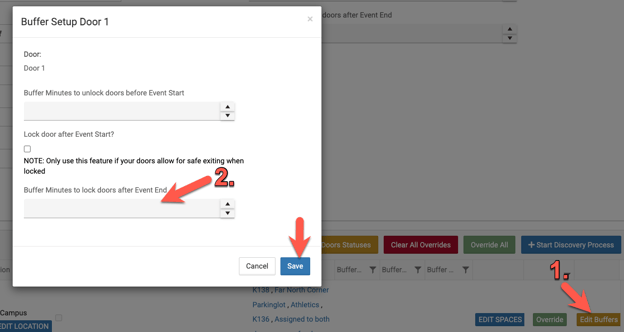 10. Once the doors are synced in, you can assign an individual buffer per door. Once a door has an individual buffer, it will ignore the global buffer set at the top of the FACILITeSPACE Access Control/Brivo page. When setting an individual buffer you can decide for the door to "Unlock" x min before the start time of the event and either A. "Return to internal Brivo Schedule" x min after the end time or B. "Return to internal Brivo Schedule" x min after the start time of the event.