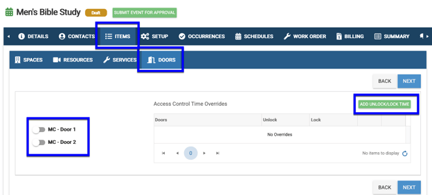 17. On the Items > Doors tab is where you can manually add or remove doors and add an override unlock and lock time. You can add one or multiple unlock and lock overrides to the event.