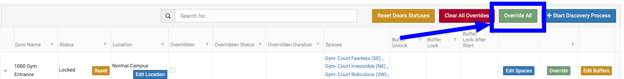 19. In the event there is an organizational emergency and you need to lock one, all or some doors, you can go to the FACILITeSPACE > Access Control > Brivo Door Setup and either click "Override" on individual doors or "Override All" and then choose a status and duration of the override.