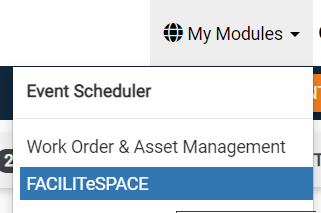 - Once SECURESPACE is added to your subscription and you have notified eSPACE Support to configure your account on the back end for your specific door company, select on My Modules at the top right of your eSPACE account and the chose FACILITeSPACE.