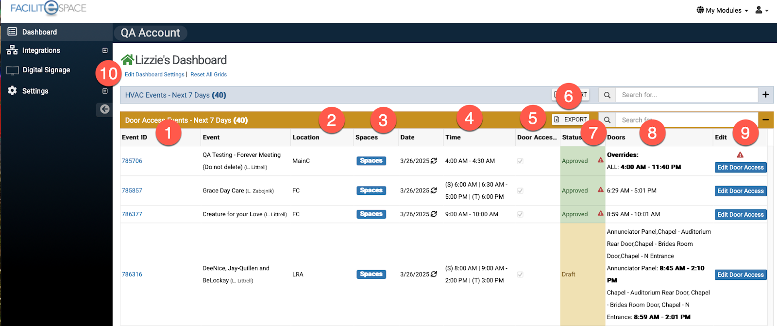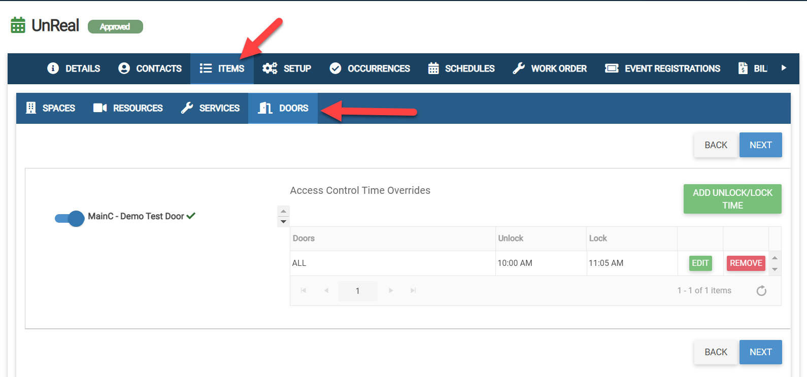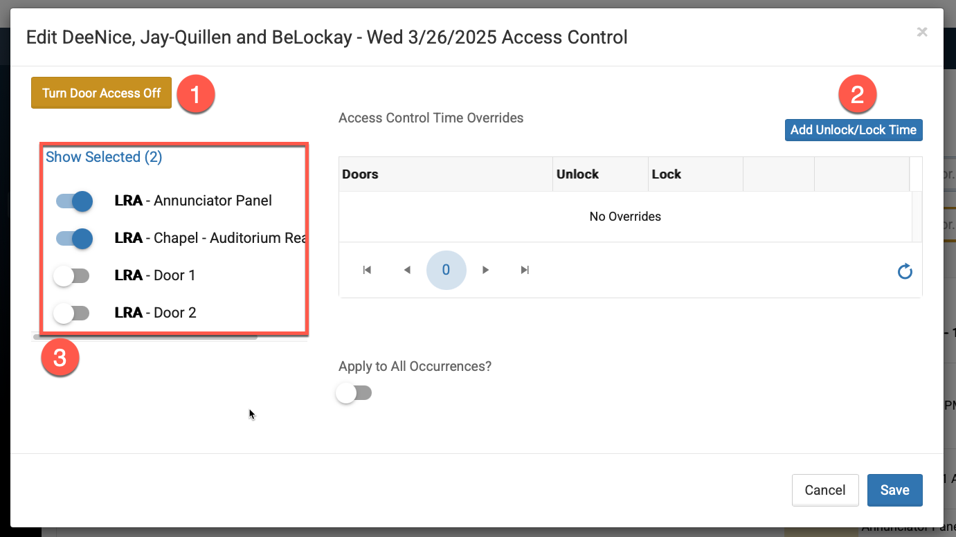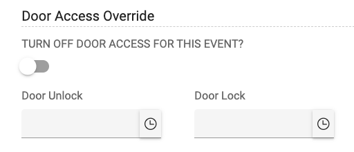 Click "Edit Door Access" on an event on the FACILITeSPACE dashboard to set an override. See below.