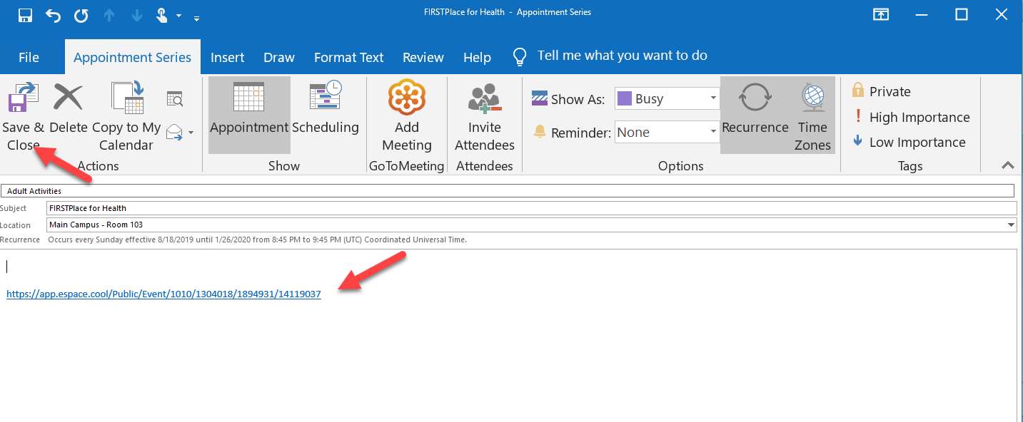 - If you are using Outlook, then your event will start downloading and when it is done, simply click on the file to open it and then select "Save & Close".