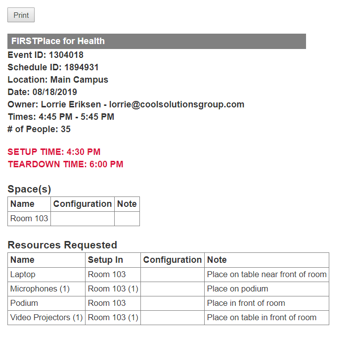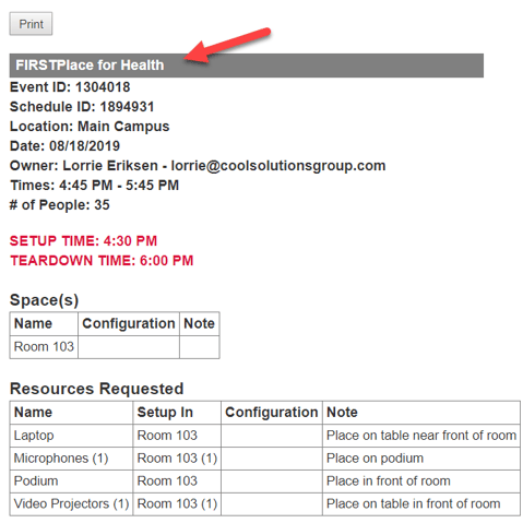 - You can click on the event name and then the URL link to see the details of the event (Setup Report). Notice that you have the option to also print the event!