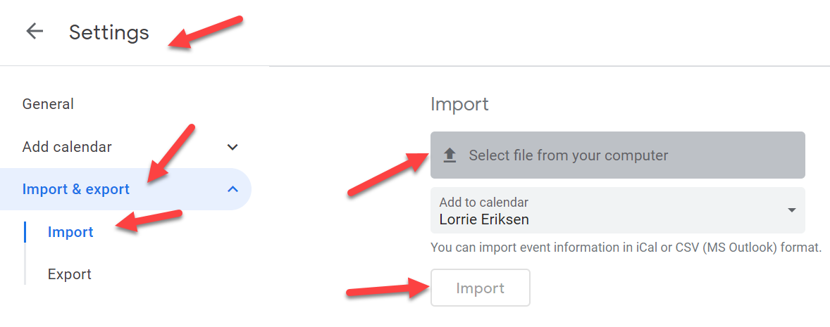- If you are currently using a Google calendar, once you download the file, go to your Google calendar and click on the "cogwheel icon" and then "Settings" (see attached).