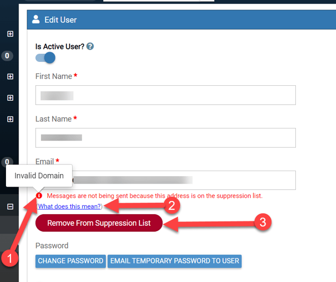 Go to the left navigation bar > Settings > Basic > Users, then choose to edit a User (one that had a suppressed email), and take note of the following: