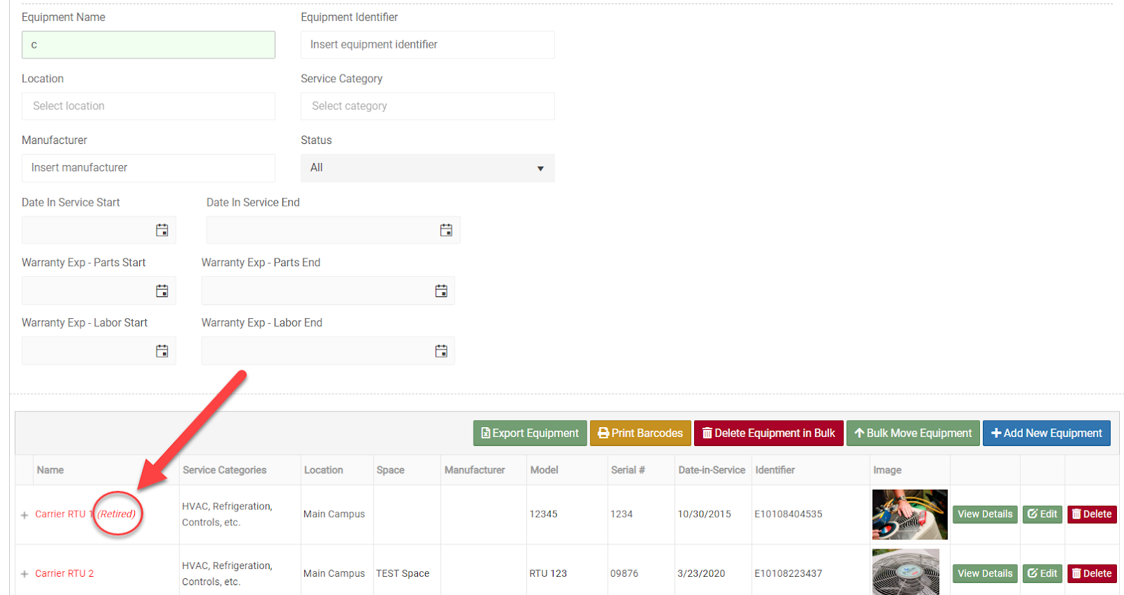 Now anytime you search for that Equipment you will see the word "Retired" in the name