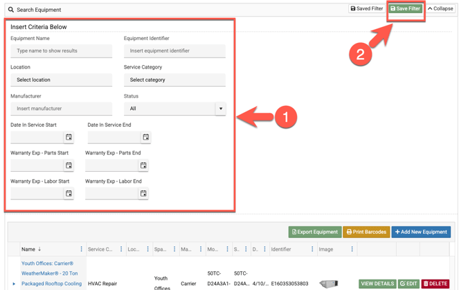 1. Using any of these fields, enter the search criteria to narrow down your equipment list.