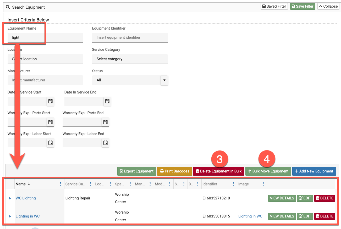 Equipment | Search, Delete or Move in Bulk