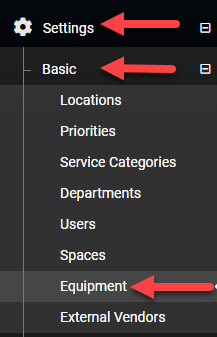 Searching for equipment begins by navigating from the left navigation bar to Settings > Basic > Equipment.