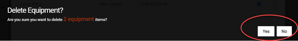A confirmation pop up window will appear. Once you select the YES button, all selected equipment will be deleted. This action cannot be reversed!