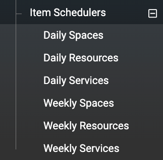 - Navigate to Calendar > Items Schedulers and choose one of the views: Daily Spaces, Daily Resources, Daily Services, Weekly Spaces, Weekly Resources, or Weekly Services.