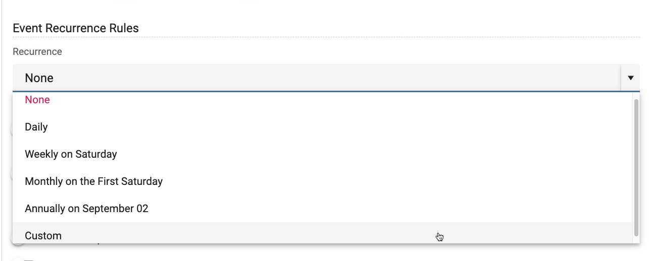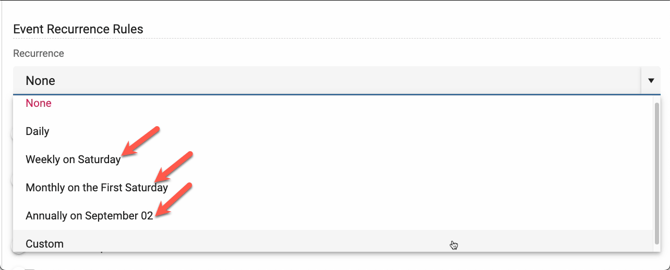 When choosing your Event Recurrence Rules, your choices are pre-populated with the day of the week of the date selected.
