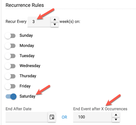 After entering the Start/End Dates as the same dates (along with the setup/end tear-down dates), choose a Recurrence Rules option!