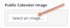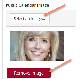 - "Public Calendar Image" - Add an image (see attached below) that will show for event registrations on your public calendar! You will see an expanded thumbnail view of the image as shown below. Notice also that you have the option to "Remove Image". The recommended image size is less than 232 KB. Anything larger than that will show sideways.