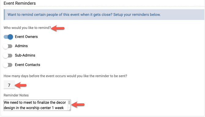 Reminder about an upcoming event: Reminders can be used if you want an email reminder to go to event owners, Admins, and/or Sub-Admins or contacts days or weeks before the event starts! You have full control of scheduling your event reminders! You can:
