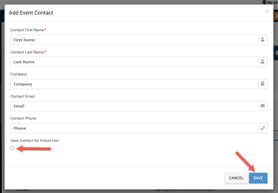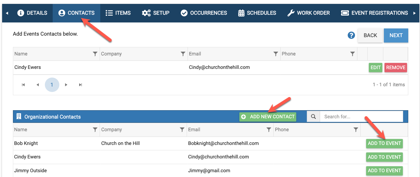 - Contacts are required when integrating with Ministry Platform. If you want to add one or more contacts to an event, simply add them to the Contact tab of the event. You can either choose to select a contact from the list of option or add a new one.
