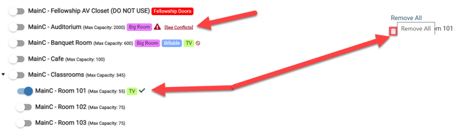 - As you review and select your "ITEMS" (Spaces/Resources/Services), you will quickly be able to identify if the item is available for your event and all occurrences. You will see either a green check mark for items not in conflict or a red caution triangle with "See Conflicts" next to it (see attached below).