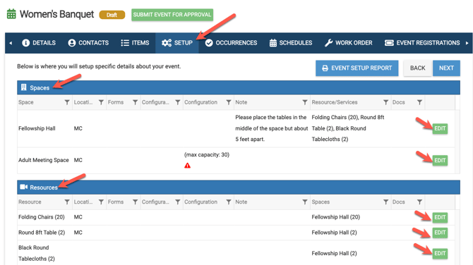 - Click the green edit button to edit any item, including configurations, notes, and associations of Resources and Services to particular Spaces, then SAVE.