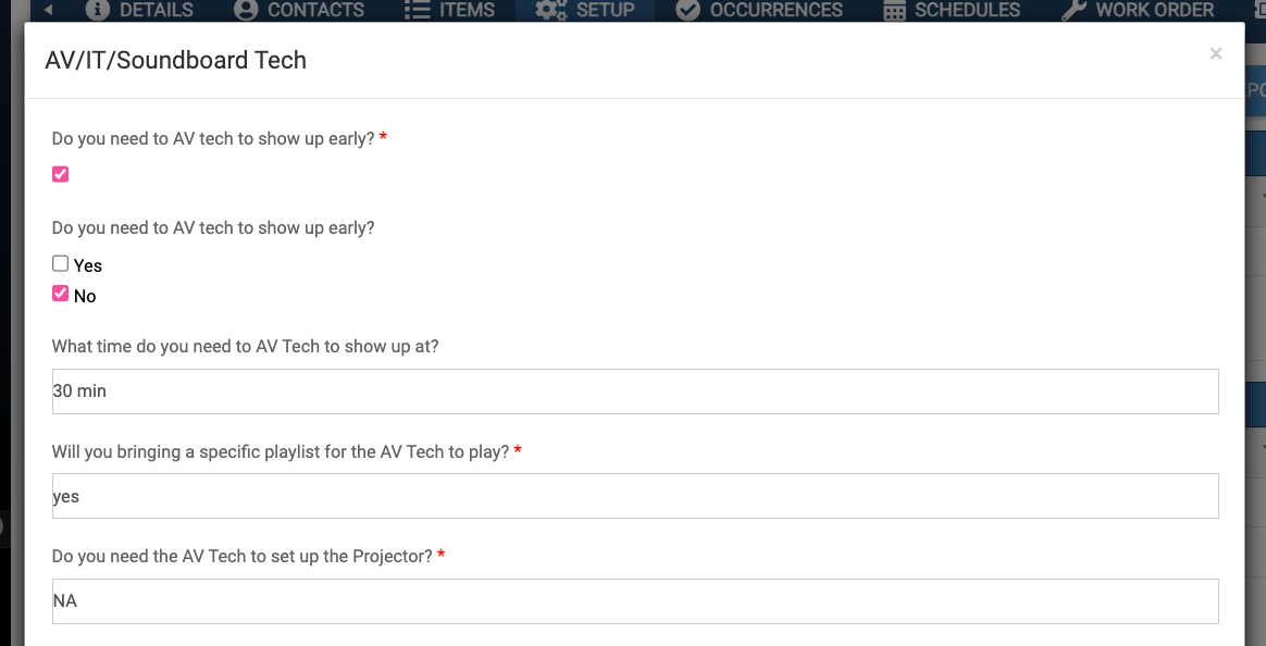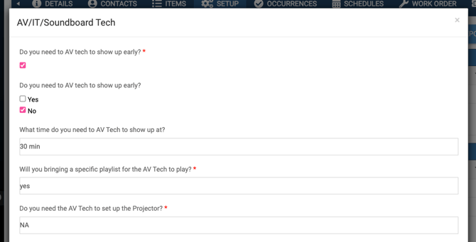 - If no setup and end tear-down times/dates are selected then conflict detection will "reserve" the spaces and resources from the beginning of the "Start Time/Date" to the "End Time/Date".
