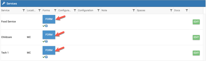 The Setup screen allows you to see if there are any required forms attached that need to be completed. There will be an exclamation mark next to it to, indicating it is incomplete. Once it is completed, there will be a green check mark and a print icon, allowing you to print the completed form. Within setup, you also can add/edit configurations, view documents, associate any item to a space, and add notes, which are reportable.