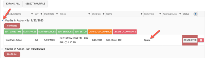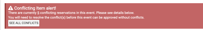 - If there are conflicts, you will see a conflicts warning at the top of the Occurrence tab. Depending on your account settings and user level and permissions, you can either click "See All Conflicts" OR "See all Items" and any item that is in conflict with another event will be highlighted in red and say "Conflicted".