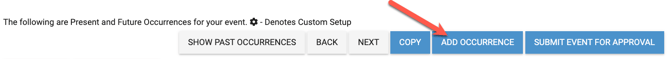 - If another occurrence is desired, click the Add Occurrence button. Event information will be cloned, but date, time, etc., can be changed. A good use for this is if you want to add a one-off occurrence or need to add one more occurrence. If you are ready to submit your event for approval, simply click on Submit Event.