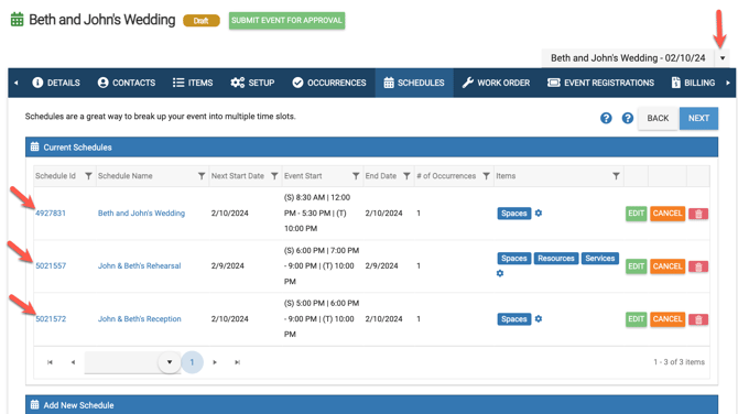 Example: A good use for adding schedules is when you have a wedding as main event and you want to add a new schedule for the rehearsal, and perhaps another for the reception. This keeps all schedules under the umbrella of the main event, which is the wedding. On the calendar, the schedules are shown according to the date, with the main event name and schedule name. On the Occurrences tab, the present and future schedules (not past) are visible, with occurrences from all schedules in date order.