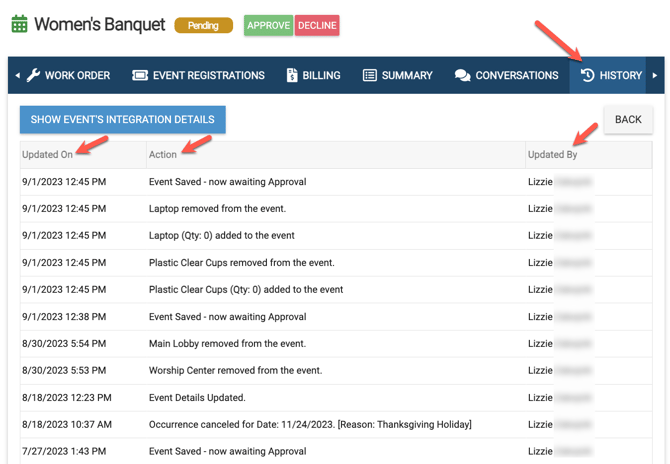 - Here, you can view the history of the event (edits, approvals, etc.), from creation to current status.