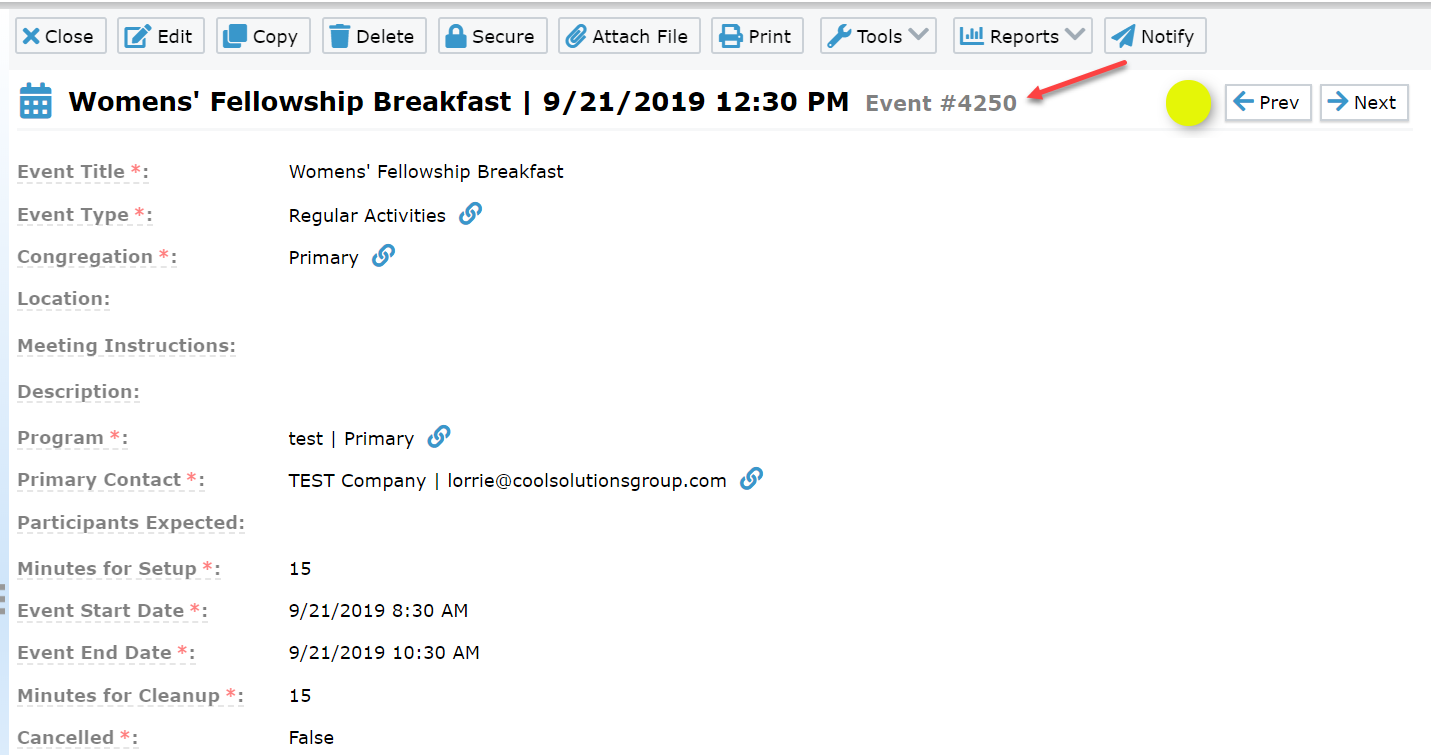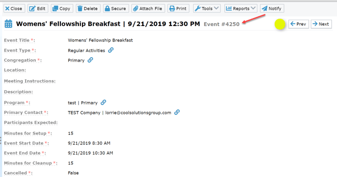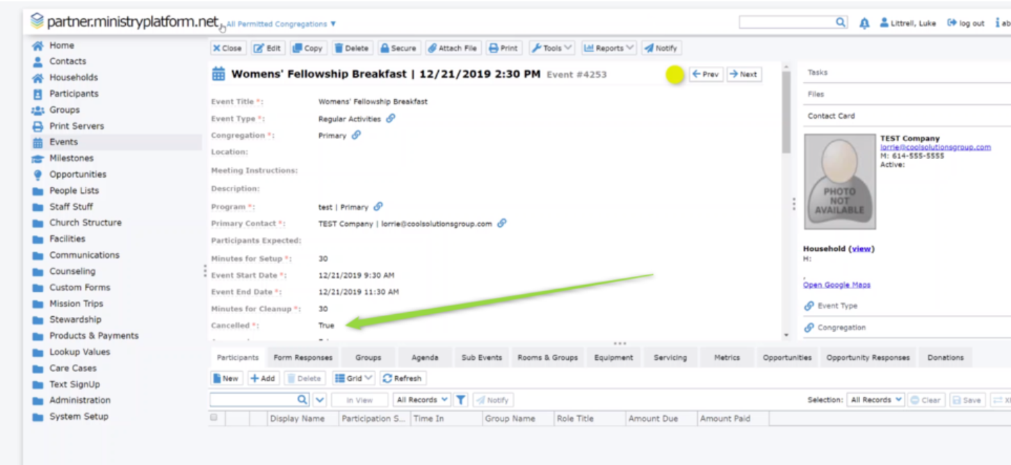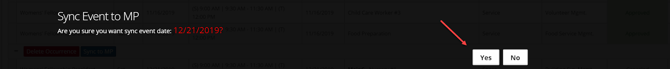 A new window will open to confirm that you want to cancel the event in MinistryPlatform.